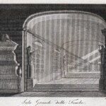 Veduta della Dogana e Carceri di Bologna. Disegno di Pio Panfili, allegato al Diario Bolognese Ecclesiastico, e Civile per l’anno 1774 (pubblicato da Lelio dalla Volpe nel 1773). Da notare la scala di accesso al Torrone delle carceri, ora scomparso e noto come scaletto (oggi esiste nei pressi un locale che si chiama Scaletto). Da notare ancora l’altana della torre Ramponi ed il palazzo Campogrande, non più esistente, che restringe l’accesso al Mercato di Mezzo, oggi via Rizzoli.