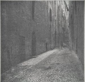 Via Giobbe (ramo da nord a sud) antico spalto della città. – Il marciapiedi che vediamo a sinistra costeggiare l’antico ospedale e la chiesa di S.Giobbe dei Guarini segna la linea dell’avanzo di muraglia di Stilicone poiché le pareti esistenti a sinistra lungo il vicolo vi appoggiano sopra e a cinque metri circa ad oriente da essa esistono gli avanzi di mura del recinto romano e sono visibili nelle pareti, a levante, delle cantine che costeggiano il detto vicolo che ora si stanno sistemando (dal libro Bologna nel Mille – Identificazione della cerchia che le appartenne a quel tempo di Angelo Finelli).